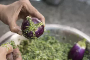 Talking about the main ingredient in Undhiya, Katargam ni papdi (the variety used for Undhiya) makes its mark at any vegetable vendor as soon as it lands in his basket. Growing up in Surat I was taught to identify the quality of the Papdi by its aroma. To that matter, I can identify the quality of all vegetables and fruits by their look, texture and smell. Papdi is the first thing the vegetable vendor will be out of stock during winter times. Undhiya is a blend of proteins, carbohydrates and vegetables, it is a complete food and can be had by itself. There are very few spices added, so that we get to enjoy the original taste of each vegetable. An attempt is also made to retain the original colour of each vegetable, after the papdi the second important vegetable which is also available only during winter is Ratalu (purple yam), there are two types available, for Undhiya we pick the round variety of Ratalu, the sweet potatoes picked are slim, the potatoes and brinjals picked are smaller size as each vegetable is carefully stuffed with fresh green garlic (grows only during winter), desi variety of coriander and freshly shredded coconut. While it is being cooked the aroma of papdi fills up the whole house, so much so that even the neighbours can identify the house in which undhiyu is being cooked.” Ranak Thakkar