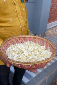 Let’s talk about Arni (Clerodendron phlomidis) today. Thankfully the depleting hedgerows near my home still have Arni vines and when the flowers are in full bloom, usually around December-January, there is a sweet fragrance that permeates all around as I walk by. My father loved kadhi made from Arni flowers so we had it once a week during the short flowering season. The flowers are plucked in the morning before they wilted and the sepal, stem and stigma are removed and discarded. Yes, a bit tedious but worth the effort. After the flowers are washed, they are drained for a while and then lightly sauteed in ghee or oil and kept aside. A regular Gujarati kadhi is made and once it is ready but simmering, the flowers are added to it and cooked briefly. Very simple but there is a wonderful, subtle flavour and fragrance in this kadhi. I’ve also made Bhajiya (pakoda/fritters) and raita using these flowers, once again sauteing them before use. I hope you will have an opportunity to try arni flowers in your cuisine.