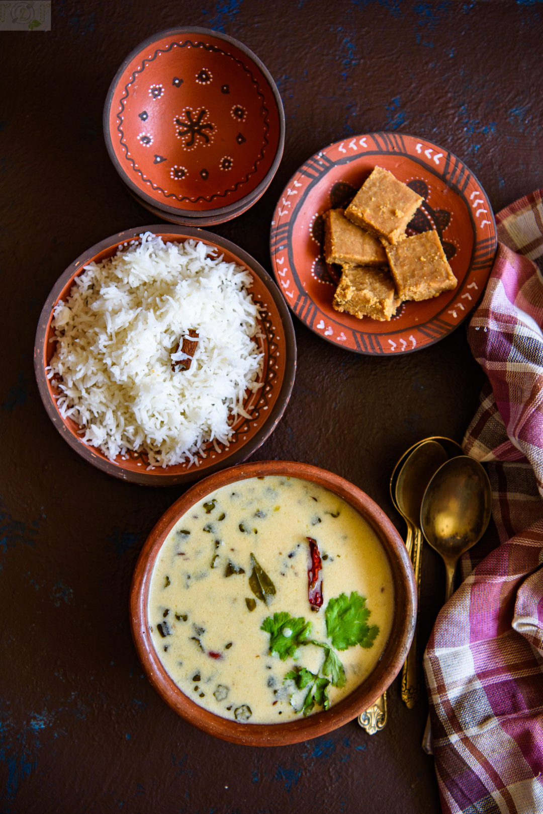 Kadhi in Gujarat is this sweet and sour yogurt soup that always accompanies Khichri that is made for dinners and makes an occasional appearance for lunch when we team it up with a dry pulse or lentil dish like moong, sprouts or moong dal. The inclusion of such lite kadhi in lieu of dal helps strike a balance when we have sprouts or pulses for lunch. The kathol or pulses are usually dry preparation and the need for liquid is compensated by kadhi. Inclusion of vegetables, leafy greens, badi-papad in kadhi is taking this humble yogurt soup to a next level. The most popular twining is that of okra and kadhi or the Bhinda ni Kadhi and summers are the time we binge on this clever preparation when we club the much loved okra with kadhi and enjoy it with rice, roti and occasional dry dal and of course the hero of the season Aam-ras!! Bhinda ni Kadhi, Ringan ni Kadhi are classic kadhi preparations we also have tuver na lilva ni kadhi, which we make during winters when fresh tender pigeon peas are in season.