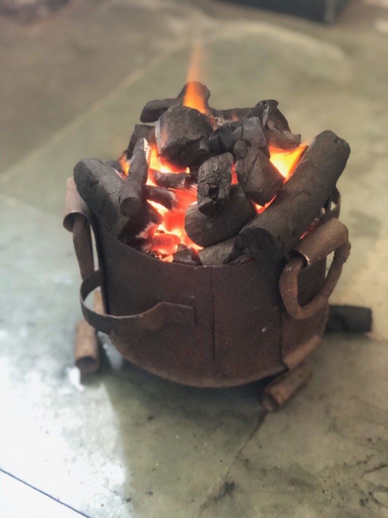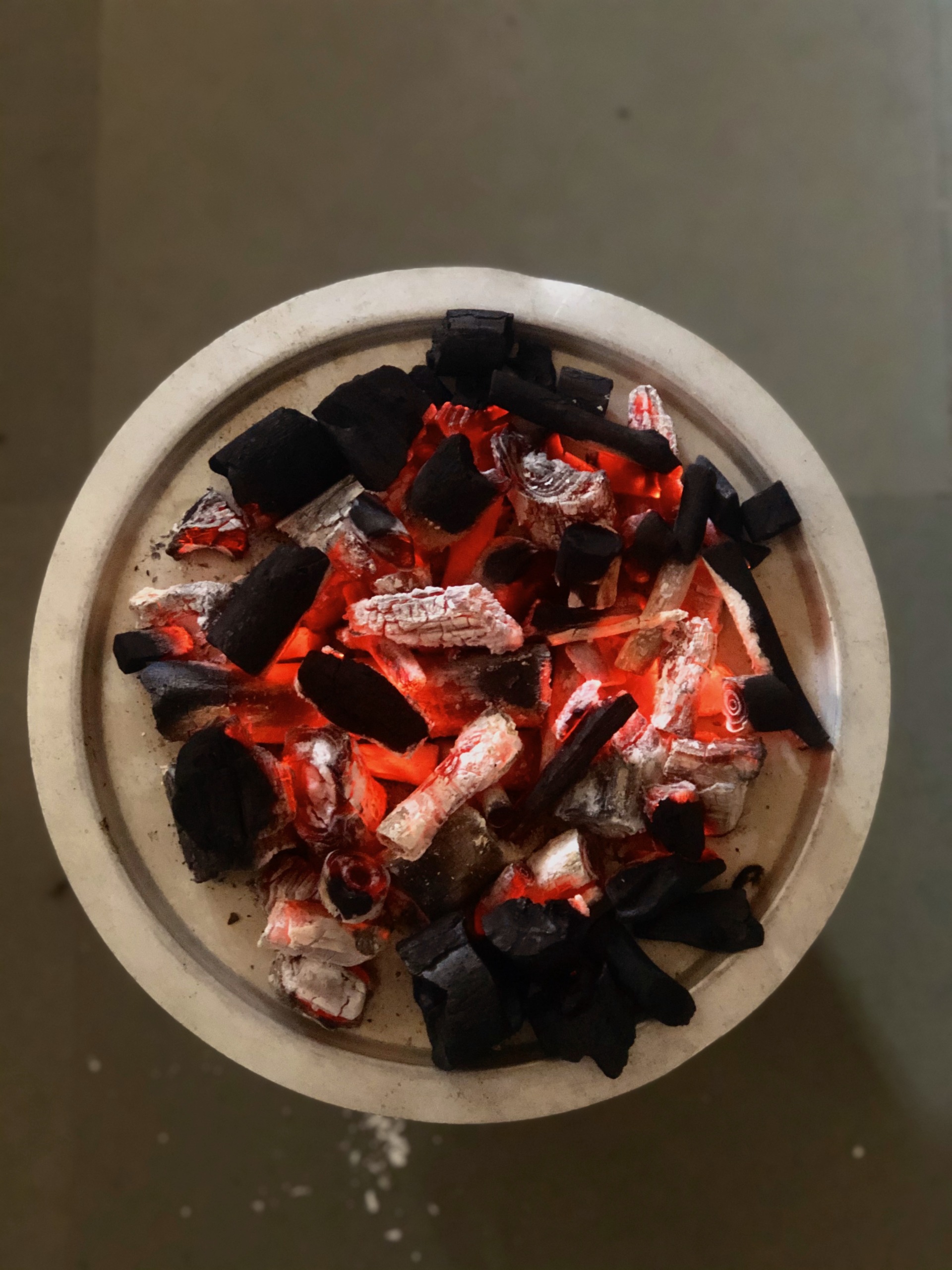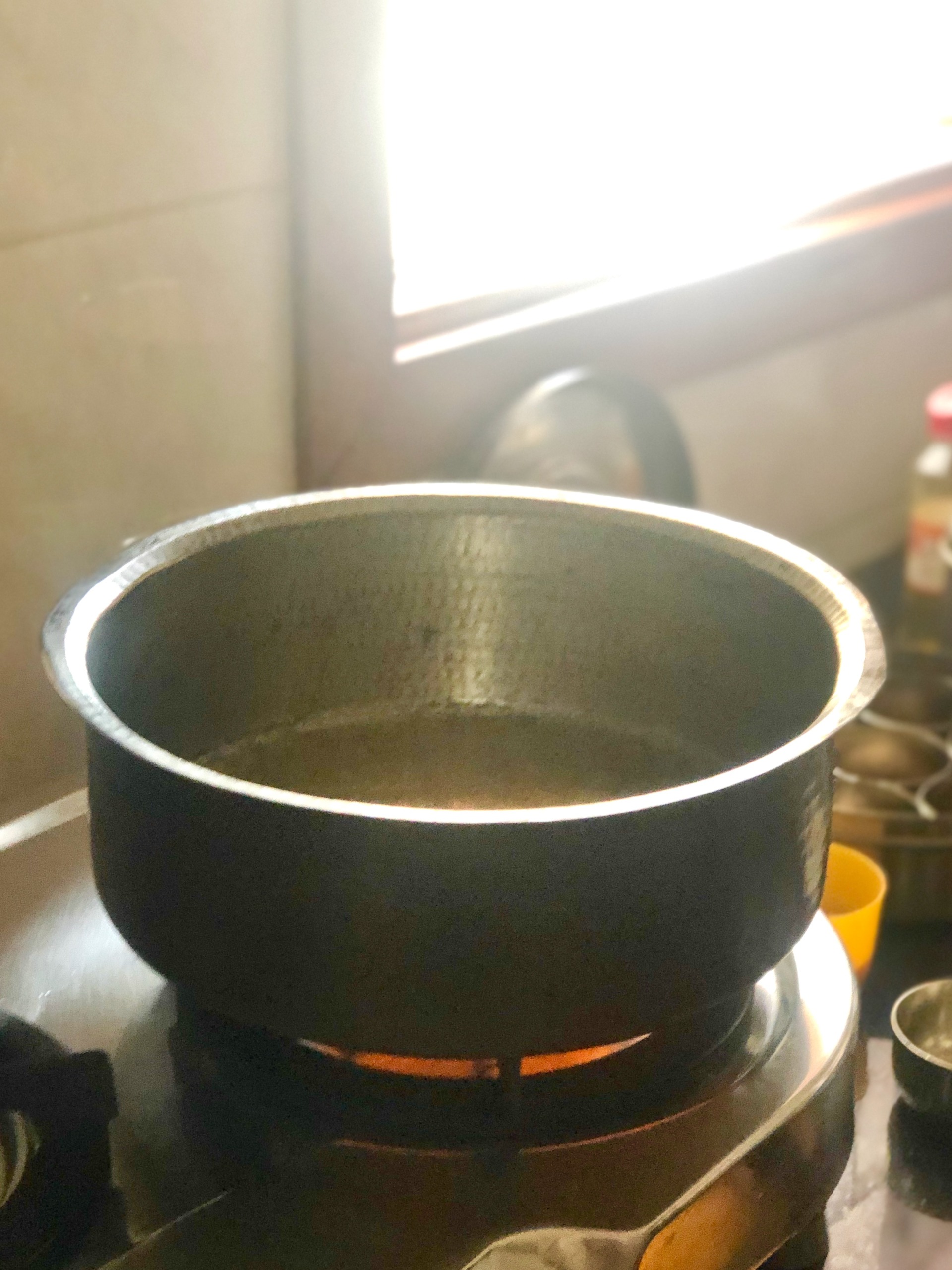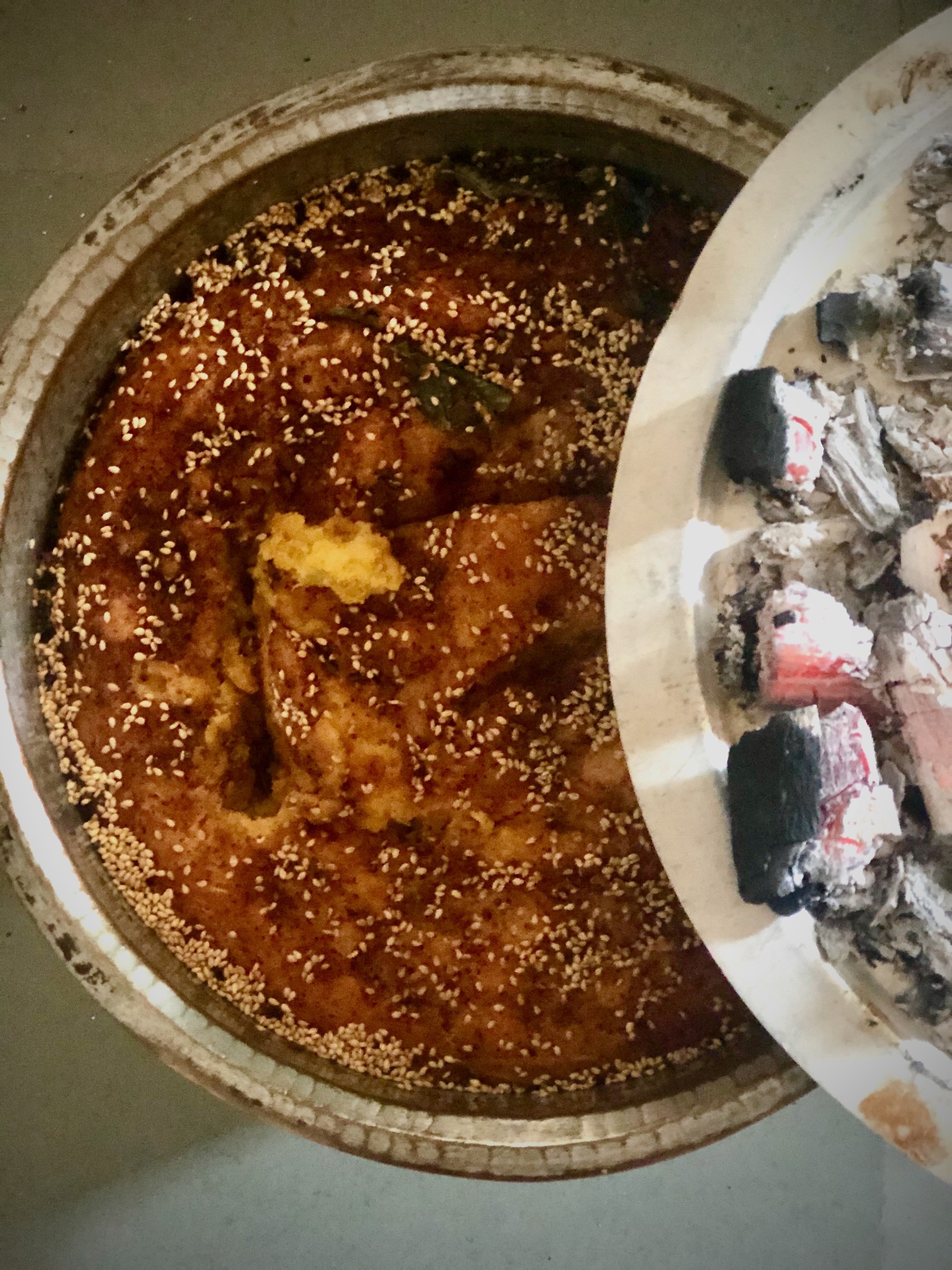 Bhoomika had once mentioned how they still make Handvo the traditional way over the coal-fired sagri/sigri in the conventional brass pan that is designed for Handvo. Just the mention of it intrigued me because in these times of convection oven and microwave cooking I haven’t heard anyone making Handvo in such traditional way. Apart from baking, the most common way of making it is in a Handvo is in the Angle cake pan shape contraption that comes with a lid and a sand tray for the bottom. The sand promotes even cooking, funnel shape helps with the quintessential Handvo crust to form all around and lid with large holes helps those intend to put coal on the top.