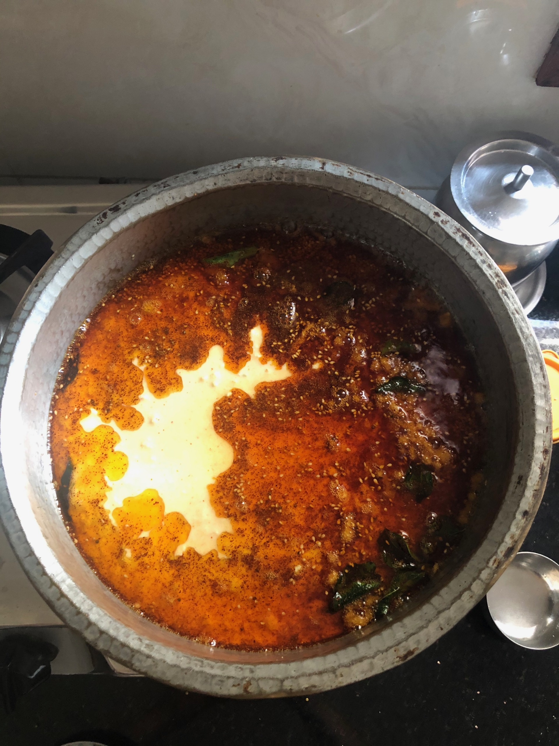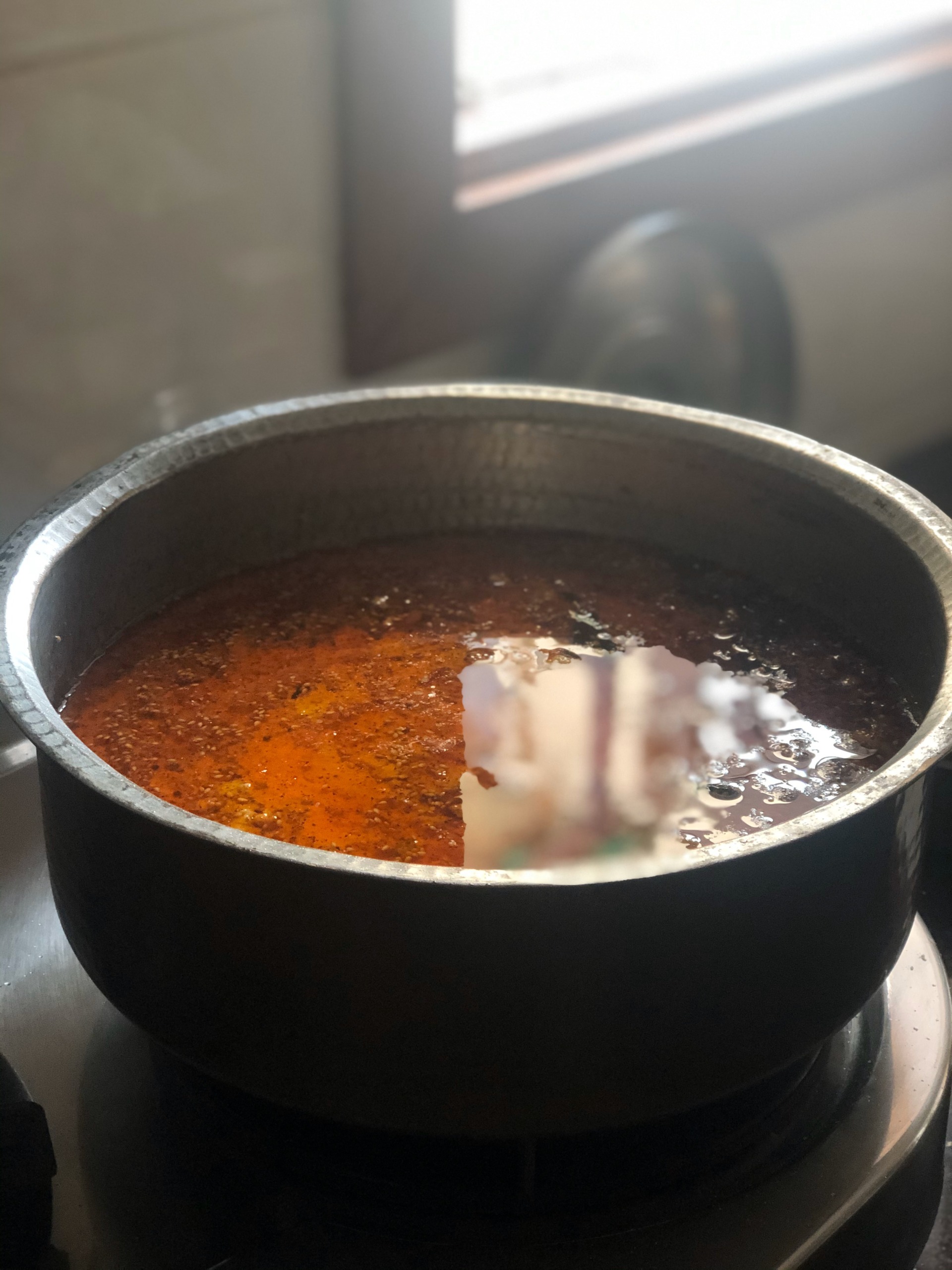 - Once the crackle and sizzle add contents of the bowl and turn off the flame. Important because you do not wat the chilli powder to burn and turn black.