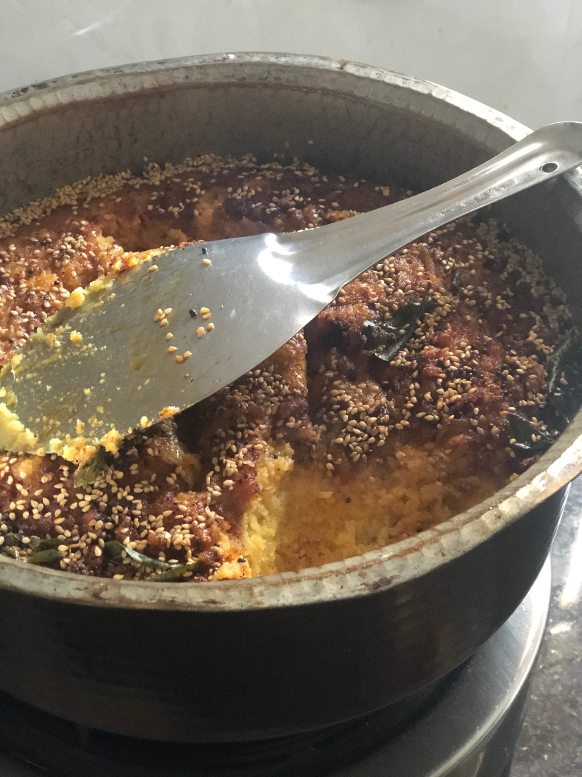 - To check the doneness, insert a knife or spatula in to the Handva if it comes out clean the Handva is done. If it does not give it some more time.