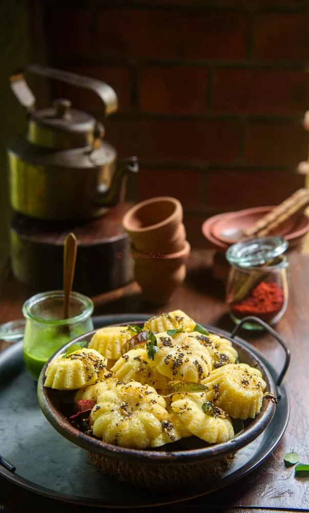 - Check for doneness, remove from the steamer and allow the dhokla to rest for few minutes, this allows the crumb to set as the dhokla will continue to cook until they cool down.