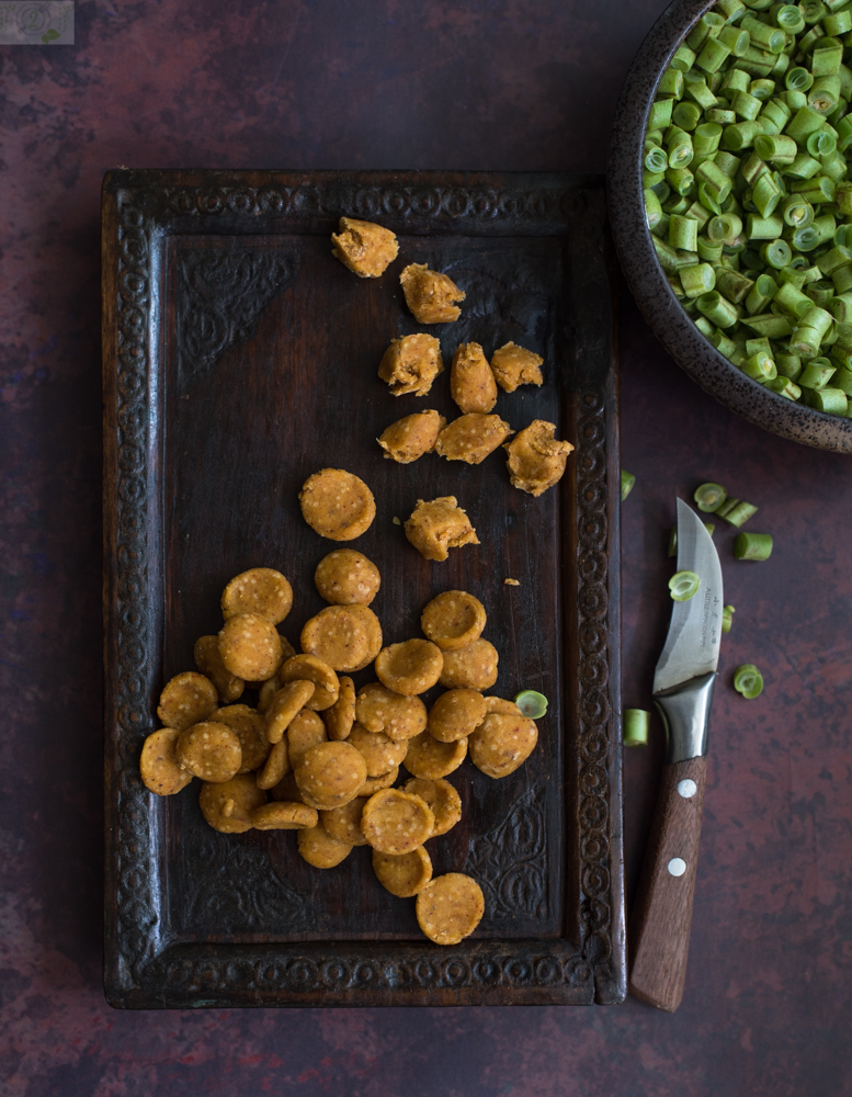 Dhokli is often referred as dumplings but I like to call them Gujarati pasta. The mention of the word Dhokli and the first dish that pops up in mind is Dal-Dhokli, a dish synonymous with Dhokli. But people who are much informed about the Gujarati cuisine will know that the Gujaratis add Dhokli to number of foods. Traditionally, Dhokli is added to vegetables, pulses and lentils. When added to pulses and lentils it turns into a filling one-pot meal whereas we prefer to add dhokli to the vegetables so that it adds up to the quantity or adding potato is not intended. However, the size and shape of the Dhokli will change when added to the veggies. Fansi-Dhokli is a very popular subzi/curry we like to prepare when tender French beans are in season. The dhokli here are small marble sized balls pressed with a thumb to shape up as small discs with a slight indent.