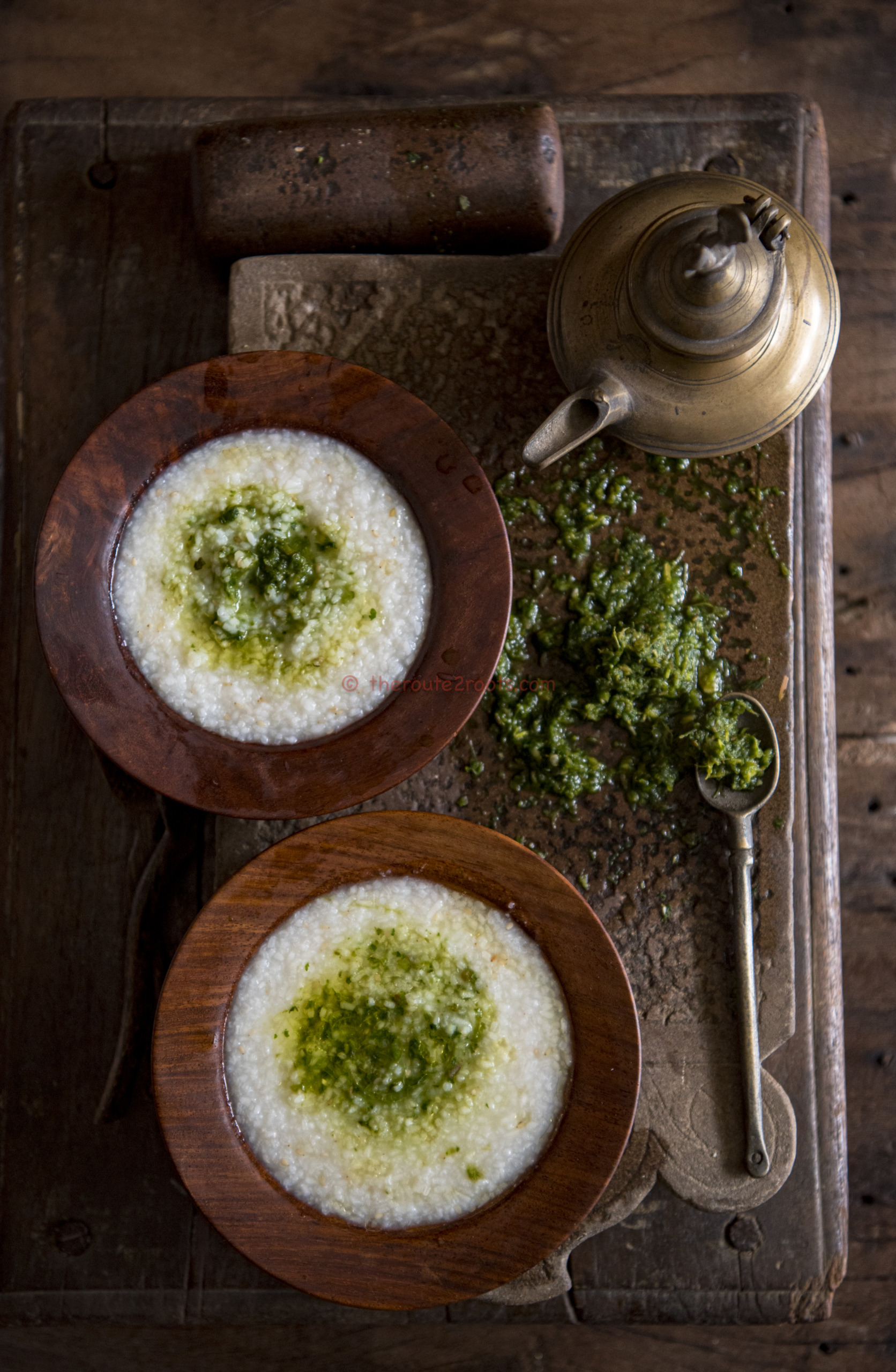 - Just when you prepare to serve, pound the coriander, chilis and garlic.