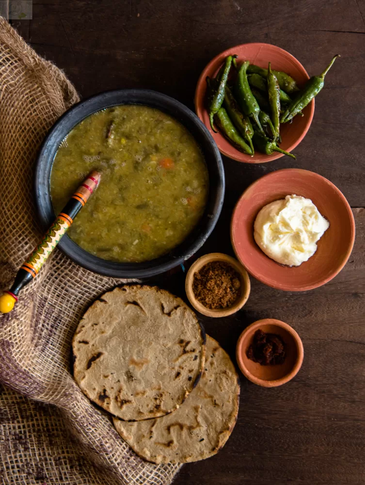 Ghooto is one of the most simple and soul satisfying dish you will ever make!! A simple slow cooked mixture of lentils and all the winter vegetables, Ghooto is enjoyed with some crumbled millet rotla/flat bread it is a meal in a bowl. The first and only time I have had Ghooto was at an organic food festival, we had attended in Rajkot a couple of years ago. The dish I am told, originates from Jodiya block of Jamnagar district. It is believed to be a staple amongst the agrarian Patel community. Ghooto derives its name from the process of ghootvu/to continuously mash the lentils and veggies against the pan with a ladle as they cook on a very slow flame and  is designed to be cooked in big batch and shared with family and neighbors ❤️. Simply put the lentils and most winter veggies except bitter gourd and methi/fenugreek leaves go in a pot and cook for a good hour or more. The best part is there are no hard and fast rules of the quantity and combination of vegetables and lentils. Use as much or as little of vegetables you prefer.  There is no tempering required and the flavors come from green garlic, green chillies, ginger and the rest.