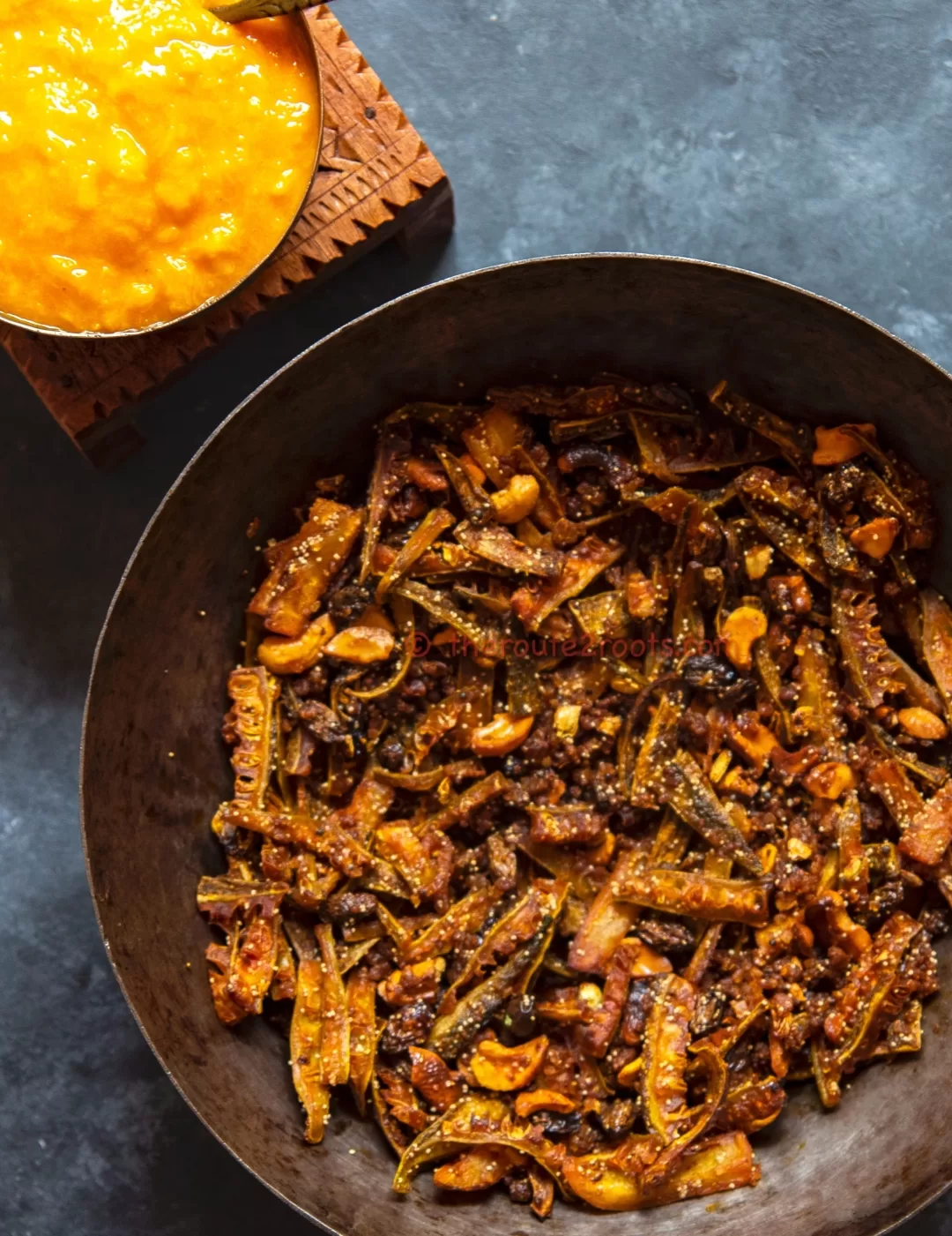 Like all home cooked recipes these too has a very relaxed approach to it. There are no hard and fast rules on how to cook it however, some care is required to ensure the right texture and taste. Use of jaggery is forbidden in this preparation as hugely alters the texture and look of the final dish. Poppy seeds or khus-khus is added at the end of the cook to enhance the appearance. In the past, the use of dried fruits and nuts was always reserved for special occasions hence, addition of deep fried cashews and raisins makes this shaak fit for an extravagant meal.