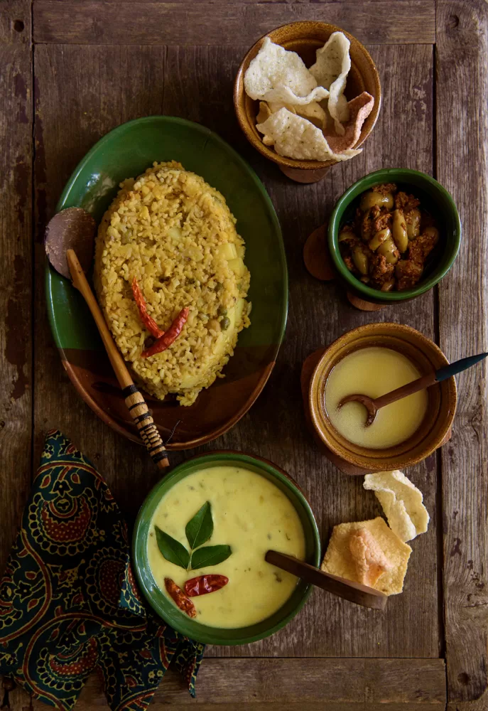 We wrote about one a few months ago. Today let me share another one of my favorites with you, a winter classic in Anavil homes. The centerpiece of this kadhi is an umami bomb created by a masala from many fresh winter vegetables abundant in south Gujarat: lilva (fresh tuvar dana), amba, haldar, leela dhana, adu marcha, and of course our utmost favorite leelu lassan.