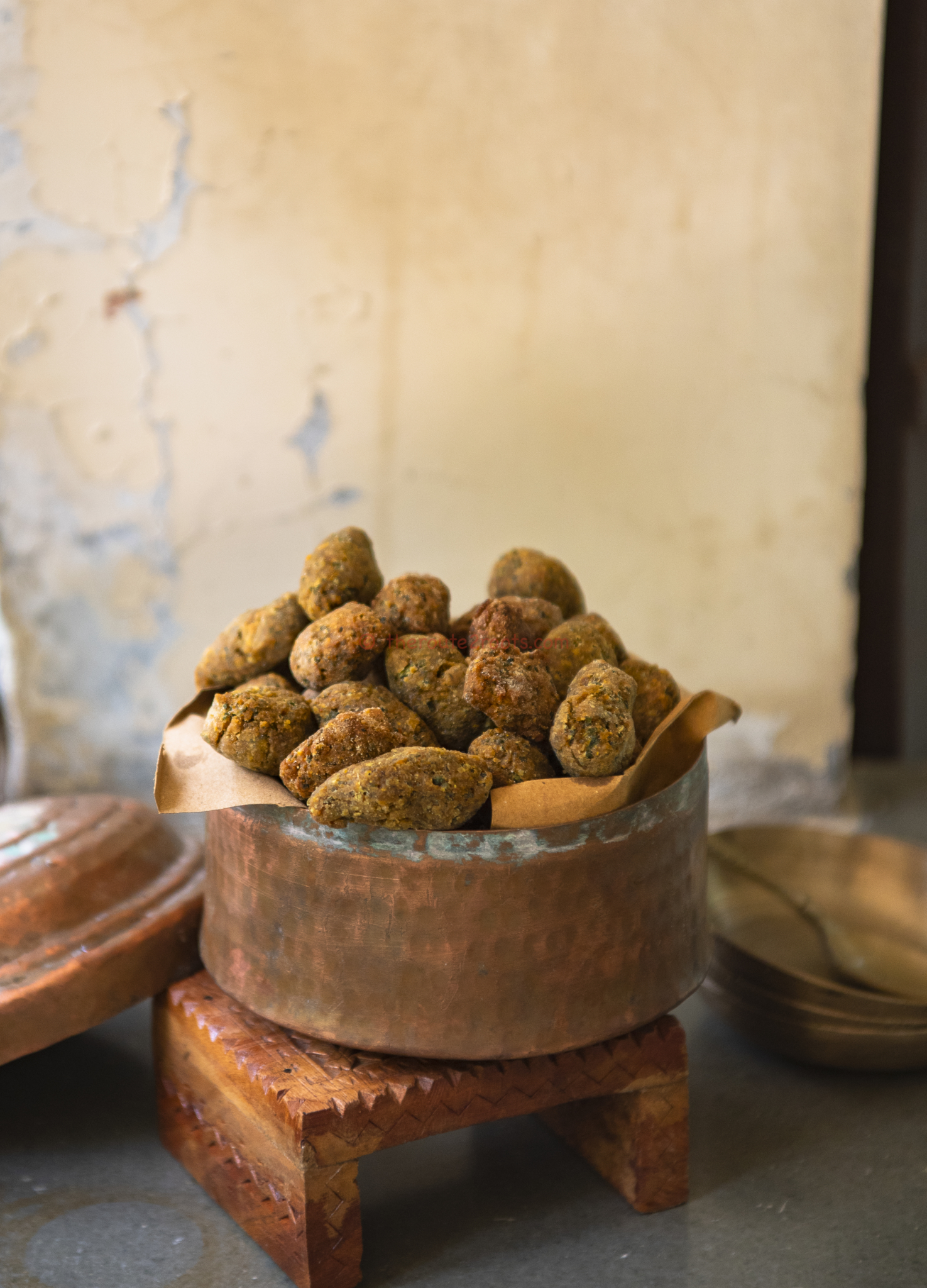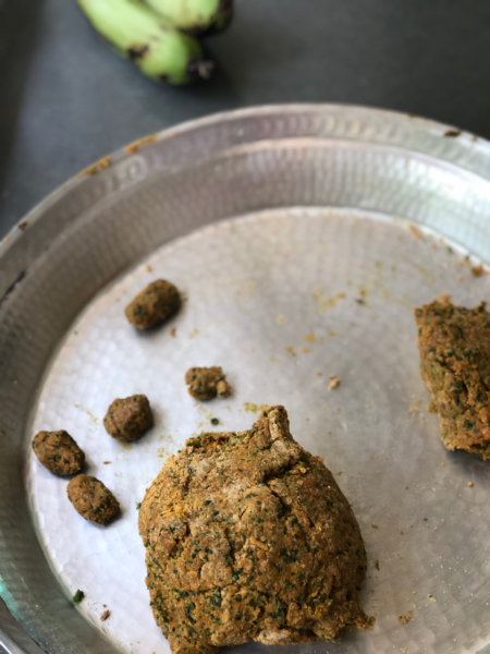 This is the third recipe in the series of 4 dishes Avani made for me to share on the blog and help me understand the Jain cuisine better. This is an heirloom  recipe that is simple but requires time and patience especially while deep-frying the Muthiya. The Muthiya are fried on medium flame to give it crisp exterior. The dough is to be kneaded gently or else you get tough Muthiyas. The peels are crushed in the old school chilli crushers you see here,  that is the only was to do it or chop them very very finely. The pictures and small video of how we made them will help you understand the process.