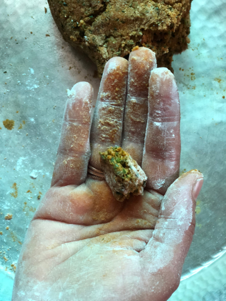 5. Take a hand full of dough and shape it like a slim log and divide into small lime sized dough balls.