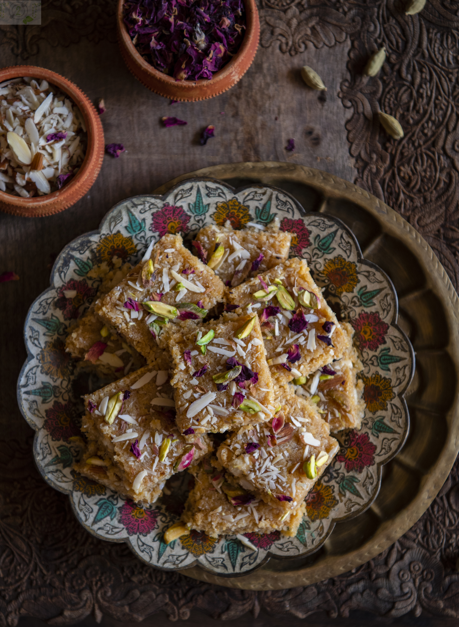 Honestly, I have not yet tasted Khadim Pak from Junagadh!! It was a friend who requested I feature this recipe on the blog. The recipe belongs to Leelavantibahen Dobariya and can be found in book named ‘Visrati Vangio No Khajano’ published by Sristi organization. Sristi has been closely working with the rural communities and strives to document local food wisdom. To learn more about the delicacy I called up RK Sweets, Junagadh and spoke to Dawoodbhai. “it is impossible to recreate this mithai at home,” he said. The fresh coconut is what differentiates Kopra Pak from Khadim Pak and it is also about the milk used for making the mawa. The coconut has to be used within minutes of grating. It was from him that I learnt how this delicacy gets its name Khadim Pak. Hopefully, I get to taste the original Khadim Pak soon….