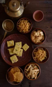 Food is the most important part of any festival we celebrate and the traditional foods associated with each festival are an outcome of ancient wisdom. Diwali, when the air begins to get nippy and winters are just around the corner we being eating Moth beans in form of Mathiya, the hero snack of Diwali (requires a special blog post). Moth beans with its body warming properties is appropriate to keep the seasonal allergies at bay. Along with Mathiya we have a series of traditional snacks made of besan that are fried in huge quantities ready to be served up along with some fresh snacks that are made for the guests .