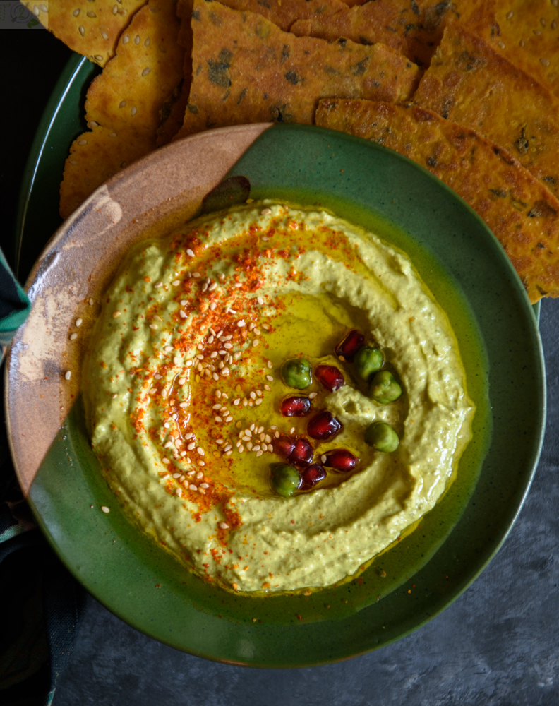 Winters, as I have mentioned here numerous times is the best season to enjoy Gujarat and Gujarati food. It is the season of plenty and the fresh produce markets is flooded with some of the best varieties of greens, beans and roots making the kitchens go into a cooking frenzy. The fresh green chana or popta/fresh chickpeas make an appearance for a very short period during the winters. While other veggies stay for a while the popta are quick to vanish and when they are available we like to use them in all our veggies or just roast and munch them. The other star attraction of winters is the lilu lasan/green garlic. It is a green that literally transforms the food scene. Even the die hard garlic critiques do not mind eating the green garlic in their flat breads, chutneys and veggies 😇. I had been toying with creating a hummus using these two unique and flavorsome ingredients when I started planning my cooks for the blog feed. I made it twice and improvised the second time. The idea is to allow the chickpeas to retain its color so never cook them in pressure cooker. Just boil them in enough water without covering and refresh them in chilled water as soon as you drain them. Once you have made it pour enough oil and consume at the earliest as it tends oxidize over time. Otherwise it is a very simple recipe to make. I chose to serve them with the handmade Khakhra we enjoy everyday. The winter flavors are quite unique with fresh methi and moth-dal!!