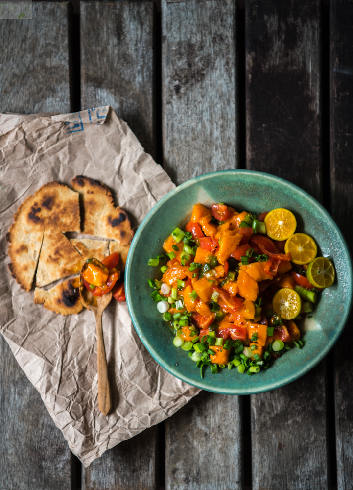 Mango Salsa…. you are wondering right?? Why would I want to turn a perfect ripe mango into something like Salsa!! Well, because the twins love it and because it is really refreshing way to enjoy perfectly ripe mangoes as a snack! Like I often mention here living in a country that does not farm or grow its own food but imports it from around the world we have access to the best seasonal produce from around the world. So if the season of strawberries have finished in the US they start arriving in the supermarkets here from Australia or South Africa. We just don’t run out of most fruits and vegetables. Although, I particularly like the produce we get from the neighbouring countries of Malaysia, Indonesia, Vietnam, Thailand…. It is more robust and flavourful and there is a wide variety of native produce. Many of the seasonal fruits and vegetables do not show up at the super market chains but are available at the local wet/fresh markets. Oh yes, I love visiting the fresh markets here and always comeback home with a large haul of beautiful local varieties.