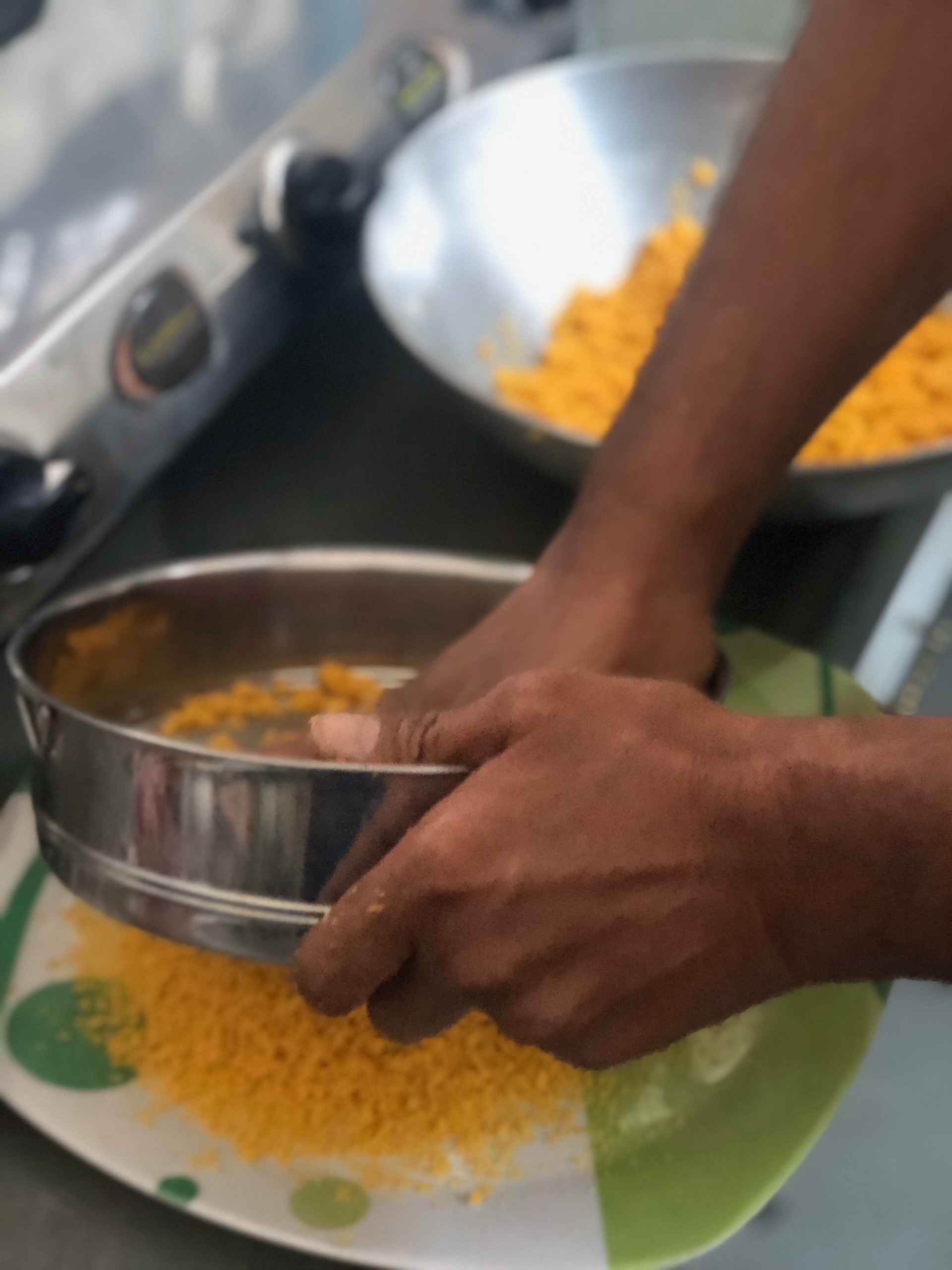 A true labour of love, preparing Mohanthal needs patience and experience. No shortcuts (the Dhabo/Dhrabo is a very important step) and no skimping on ghee or sugar. I have loved a good Mohanthal, perfectly roasted and granular textured slices that I keep reaching for until the bottom of the tin begins to show up (in case of chutto/lose Mohanthal). My quest for a perfect recipe brought me to my backyard or should I say front-yard. My maternal home has a 60-year-old farsan shop at its front yard. They make the best samosas in town. Sarika and Bhabhiji informed they also make excellent Mohanthal. On my request Gaman, their head cook came over to teach the tips and tricks to a perfect Mohanthal.