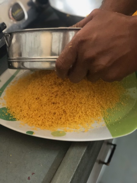 - Now take a large thali/dish and large holed sieve. Pass the flour through the sieve.