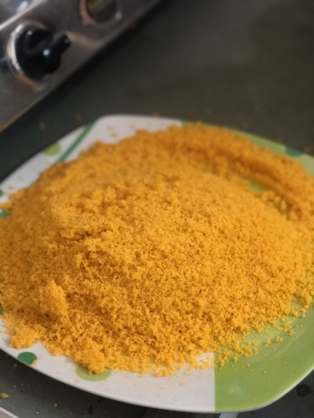 - Fry the flour until it turns pale brown/ almond skin colour. The stove flame has to be medium to low.