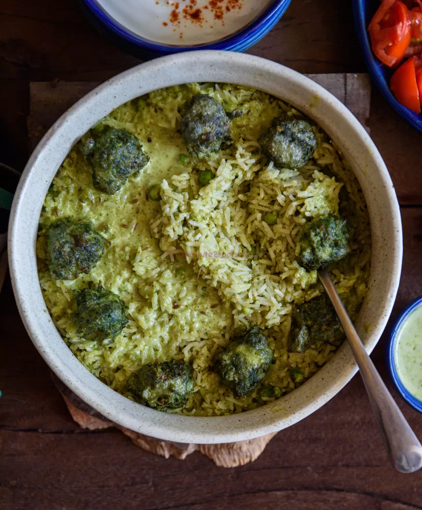 Palak Pakora Rice in Coconut Milk Curry, a divine tasting rice dish that is sure to please one and all. It is kind of the dish that goes on to be a meal in itself, a one pot meal that has all the right elements to please our palate. Soothing coconut milk spiced with coriander chutney goes on to become the element that gives this dish its wow factor. The coconut curry makes it rich in taste but not in fat and that is the best part about it. Yes, there are a few steps to this rice dish but if you have all your ingredients ready you should be able to wrap it up in less then an hour.