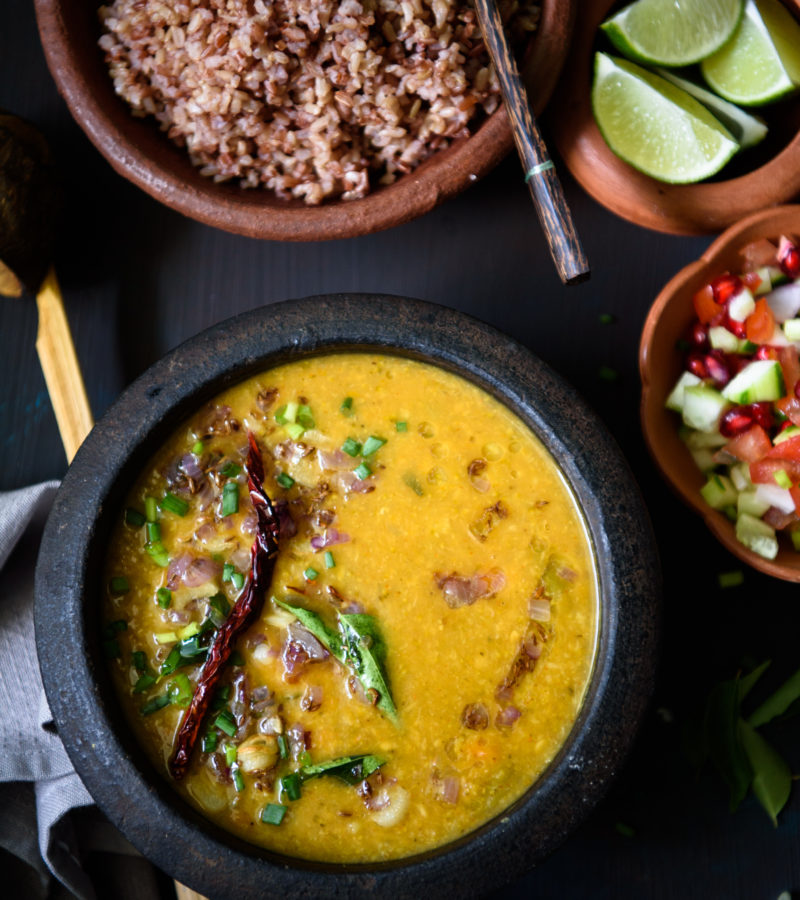 All of us have certain favorite ways to deal with those few last bits of vegetables that keep staring as us from the vegetable tray of the refrigerator!! That quarter cauliflower, one carrot, last remaining shelled peas, quarter gourd, a slice of pumpkin all of which did not make it to the main dish we had cooked using those veggies!! My favorite is to make Pav Bhaji or a Khichri using them but, veggies like pumpkin and bottle gourd do not find a place in such dishes requiring us to come up with some more creative options. That is when our grannies might have thought of this recipe or there would be too many fussy eaters in the family who might not be in favor of eating vegetables and that is when this ‘Shaak wali Daal’ comes to rescue. It is  a dal that combines the lentils and vegetables and cooks up into a one pot mix of Daal and Shaak. No one would realize what all veggies went into it except if you choose to add beetroot or bitter gourd 🤪…It is a pretty simple one to make, all you need to do is allow the Dal Shaak to slow cook on gentle heat and then wake it up with a good shake using the traditional dal churner until the vegetables break up into almost invisible slivers not the well cooked daal. Temper it with ghee roasted garlic and cumin and serve it  with some rice or roti. I prefer it with red rice for my dinner!! Believe me dinner couldn’t have been quicker and  simpler!!
