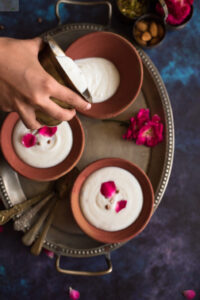 - Allow the yogurt to drain for 3-4 hours. If using, add the rose petals at this stage.