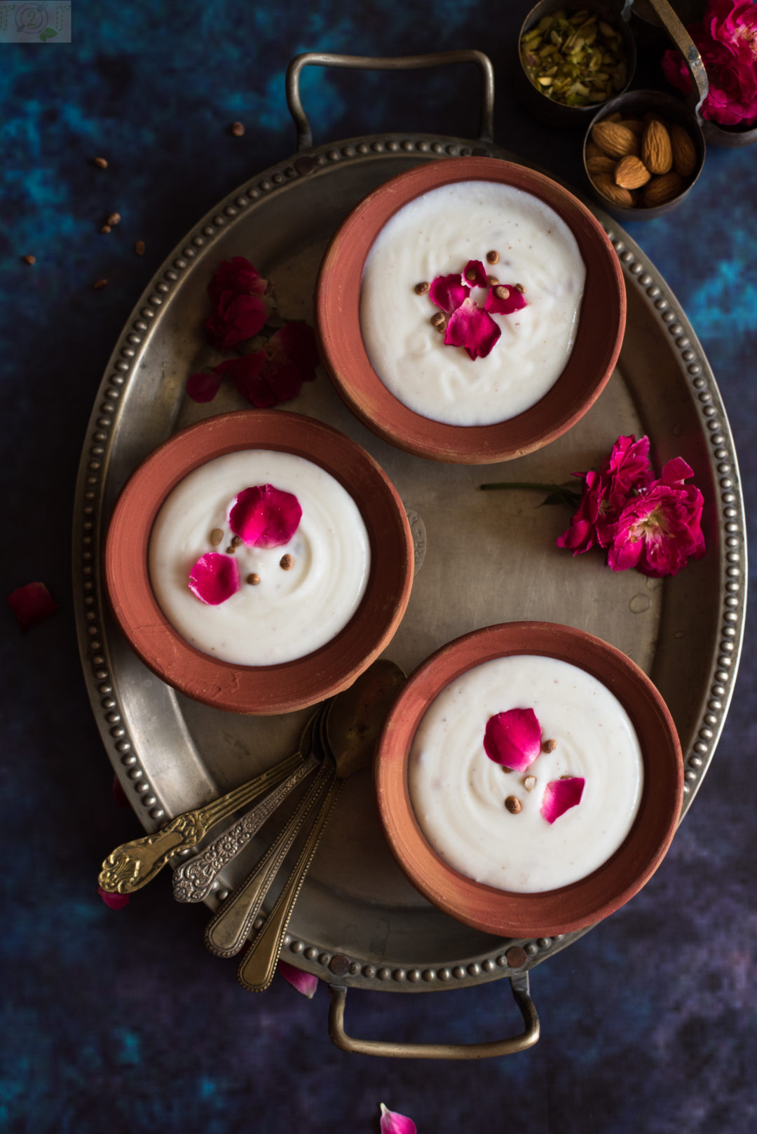 - Serve in Shakora (mitti kulhar) garnished with rose petals, slivered almonds and charoli.
