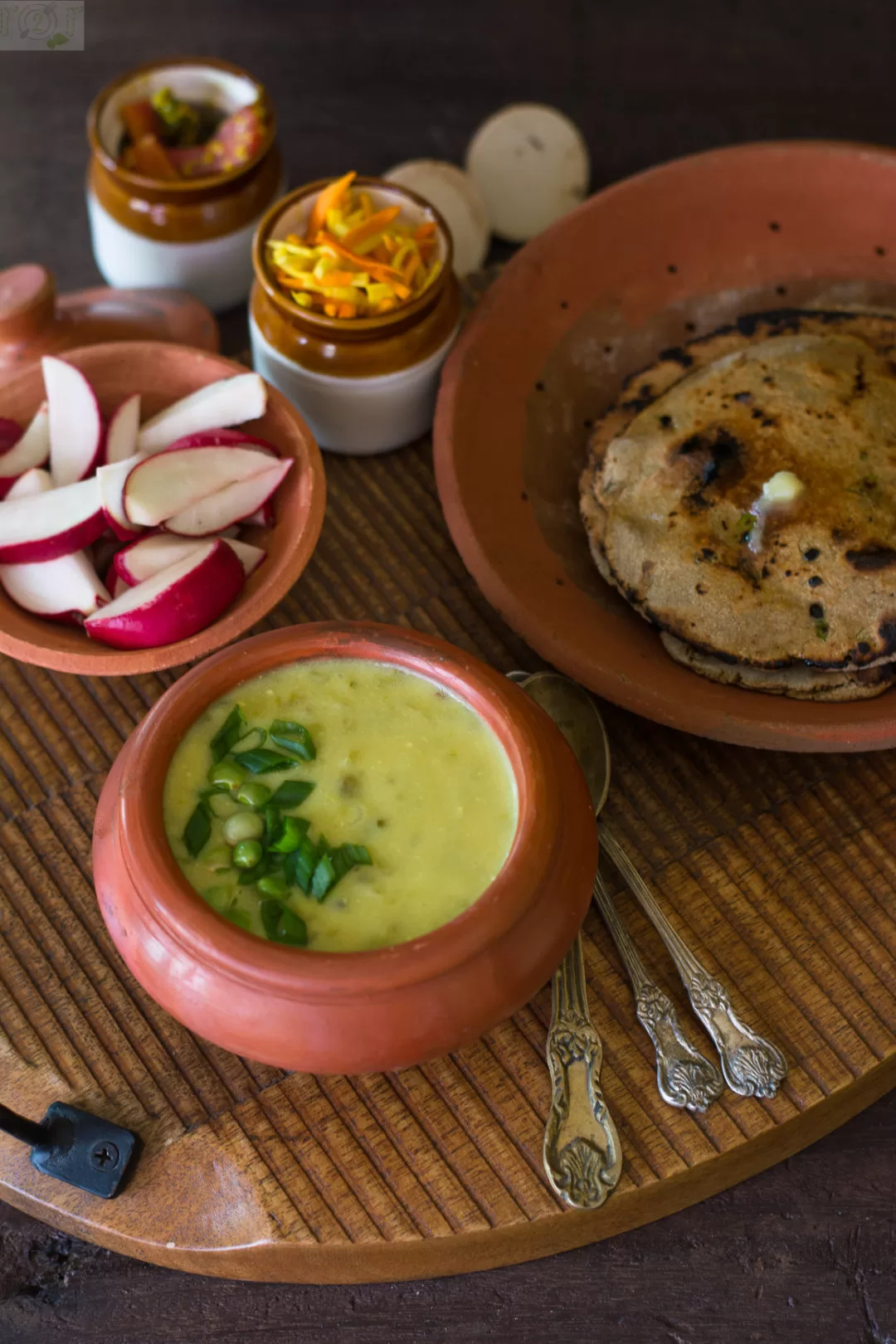 The Gujarati cuisine offers a variety of ways of combining vegetables and Kadhi, we have binda (okra) ni kadhi, ringan (brinjal) ni kadhi, methi (fenugreek) ni kadhi, vadi (lentil dumplings) ni Kadhi and so many more. The homemakers are really creative in combining seasonal vegetables with the yogurt soup. The recipe of Tuver Na Lilva Ni Kadhi was shared by one of my Bhabhi and this is how tuver is enjoyed in her part of rural Gujarat, the south of Gujarat. Since I had never tasted it before, I tried making it myself after she shared the recipe on phone!! It did turnout as expected, very wholesome and filling. You may increase the amount of green garlic and chillies to suit your palate. I would like to mention that as it is with all such heirloom recipes there is no need to adhere to exact proportions. Use your instinct and make alterations to suit your palate.