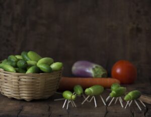 Back then no TV or gaming gadgets meant we spent lot of time outdoors roughing it out with whole lot of playmates or listening to stories our Ba told. While summer and other holidays were spent with Nani the rest of the year passed in warm care of our Dadi. My Dadi too had her own unique way of keeping us kids busy while our Mums attended the chores. One of the task that she was responsible for was chopping and cutting the veggies. So while she chopped, she made us pluck and pod the greens etc. along with narrating to us stories of ghosts or Phanchtantra or might and velour. She also had this interesting tricks of creating creatures from the raw veggies she chopped. So a long brinjal would become a swan and the tindora became sheep and she never stopped sharing events related to animals she made or talk about phrases and stories associated with it……