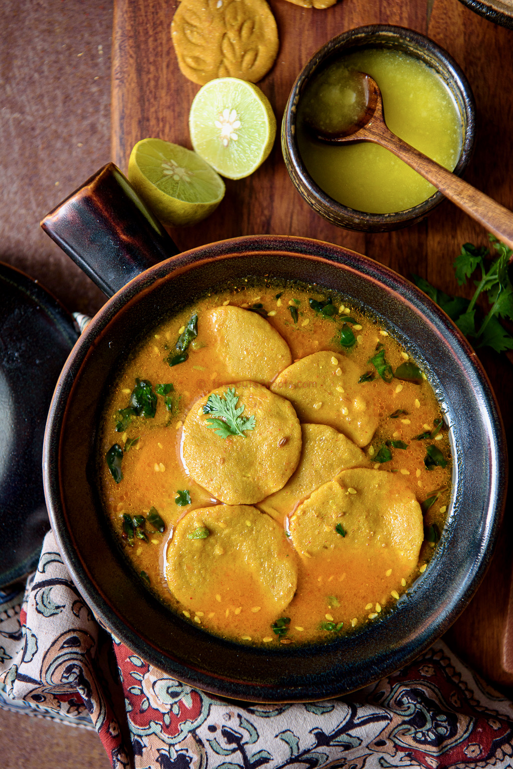 Isn’t food supposed to be like so, frugal yet delicious, cooked with minimum effort and ingredients but maximum on flavour and value? Uchada Pani ni Dhokli, the charm of this name does get lost when transliterated, into Dhokli in boiling broth. However, to those conversant with Gujarati the name sounds like Ba instructing us to when to add Dhokli discs into the broth, Uchadvu means to jump, bounce represents roaring boil here, telling us to add the dhokli discs to the broth that is on a roaring boil. And to allow them to cook on high.