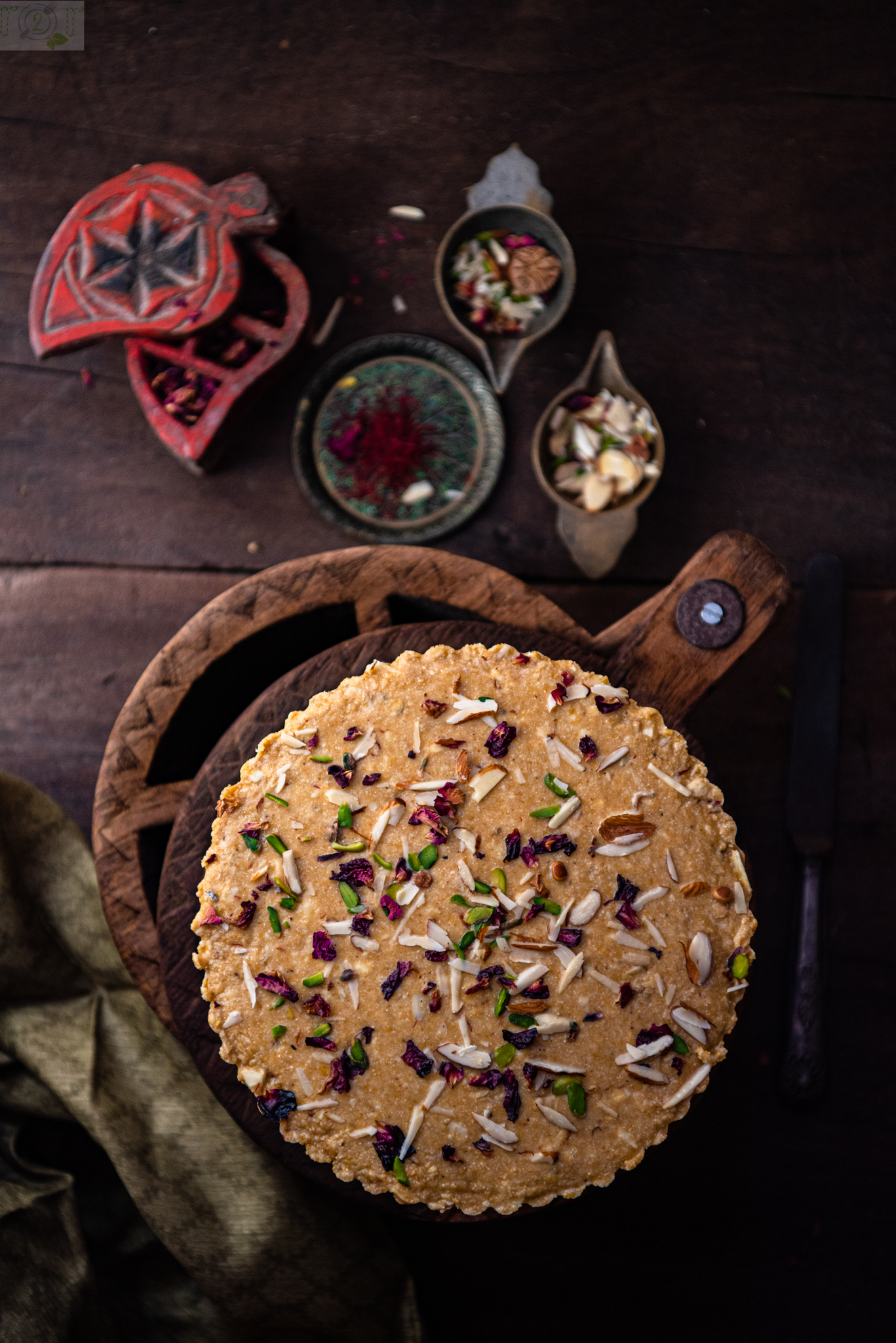 Take couple of tablespoons of ghee and roast the dessicated coconut and 1/2 cup of almond and pistachio slivers.