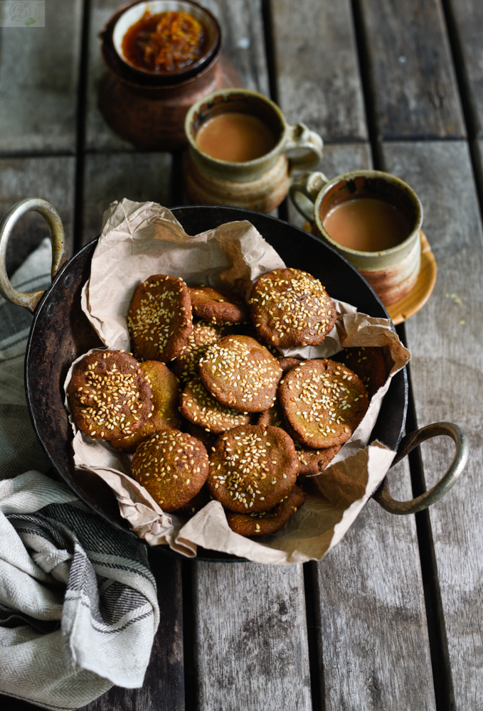 - Take a plastic or a grease proof paper, place a dough ball on it, sprinkle some sesame seeds and flatten the ball to a 2 inch disc. (like shown in the picture)