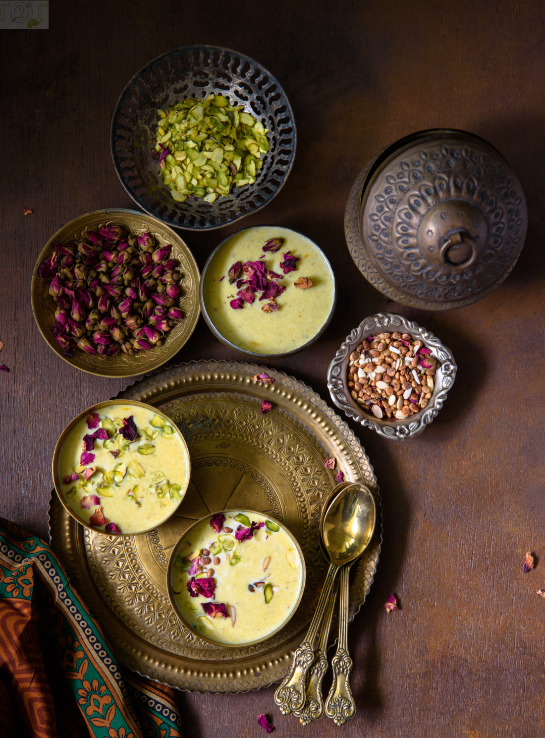 Transfer the Shakkariya ni Rabdi to serving bowl and garnish with slivered almonds and pistachios.